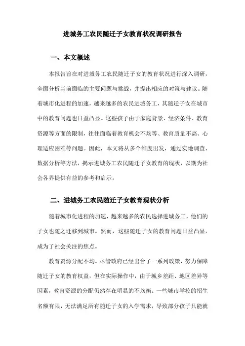 进城务工农民随迁子女教育状况调研报告一、本文概述本报告旨在对进城务工农民随迁子女的教育状况进行深入调研,全面分析当前面临的主要问题与挑战,并提出相应的对策与建议。