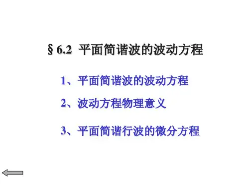 如果波沿 x 轴的负向传播,P 点的相位将比 O 点的振动相位超前2x πλ沿 x 轴负向传播的波动方程为02c o s y A t x πωϕλ⎛⎫=++⎪⎝⎭利用 2ωπν=, u λν=沿 x 轴正向传播的平面简谐波的波动方程又可写为02c o s y A t x πωϕλ⎛⎫=-+⎪⎝⎭02c o s A t x u πνωϕ⎛⎫=-+⎪⎝⎭0c o s x A t u ωϕ⎡⎤⎛⎫=-+ ⎪⎢⎥⎝⎭⎣⎦即 0c o s x y A t u ωϕ⎡⎤⎛⎫=-+ ⎪⎢⎥⎝⎭⎣⎦原点的振动状态传到 P 点所需要的时间 xt u∆=P 点在 t 时刻重复原点在 x t u ⎛⎫- ⎪⎝⎭时刻的振动状态波动方程也常写为x02c o s y A t x πωϕλ⎛⎫=-+⎪⎝⎭()0c o s A t k x ωϕ=-+ 其中 2k πλ=波数,物理意义为 2π 长度内所具有完整波的数目。