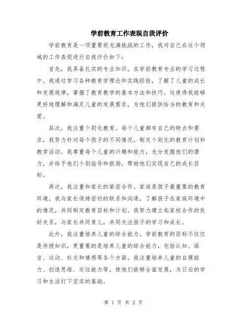 学前教育自我评价我是一名学前教育工作者,我非常热爱教育事业,尤其是对于学前儿童的教育工作充满激情。