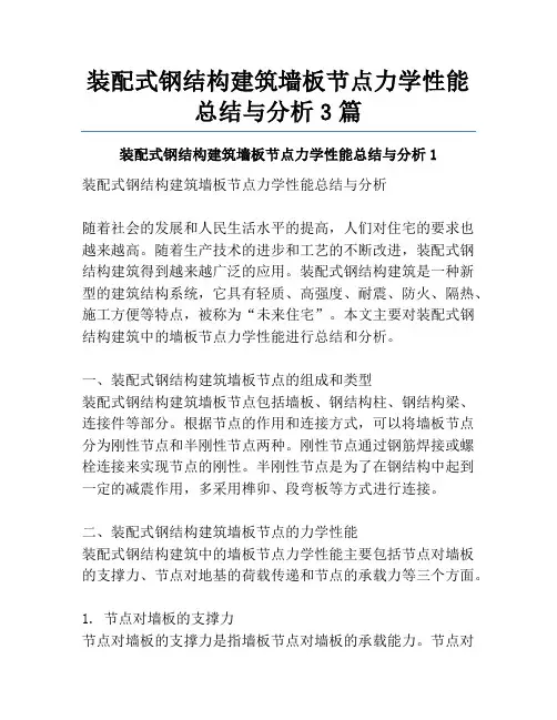 二、装配式钢结构建筑墙板节点的力学性能装配式钢结构建筑中的墙板节点力学性能主要包括节点对墙板的支撑力、节点对地基的荷载传递和节点的承载力等三个方面。