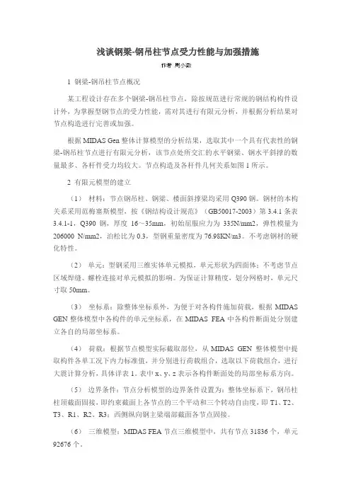 浅谈钢梁-钢吊柱节点受力性能与加强措施1 钢梁-钢吊柱节点概况某工程设计存在多个钢梁-钢吊柱节点,除按规范进行常规的钢结构构件设计外,为掌握型钢节点的受力性能,需对其进行有限元分析,并根据分析结果对节点构造进行完善或加强。