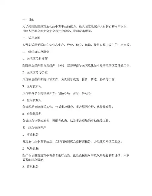 二、预案适用范围本预案适用于医院内发生的化学中毒事件,包括但不限于以下情况:1. 化学品泄漏;2. 化学品误服;3. 化学品吸入;4. 化学品皮肤接触;5. 其他化学中毒事件。