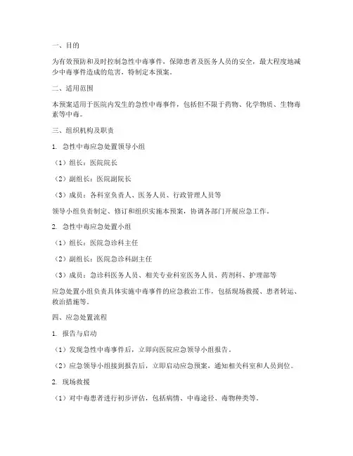 二、适用范围本预案适用于医院内发生的急性中毒事件,包括但不限于药物、化学物质、生物毒素等中毒。