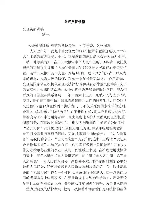 公证员演讲稿公证员演讲稿篇一:公证处演讲稿尊敬的各位领导、各位评委、各位同志:大家上午好!我是来自公证处的X XX!很荣幸能参加这次“十八大”主题的演讲比赛。