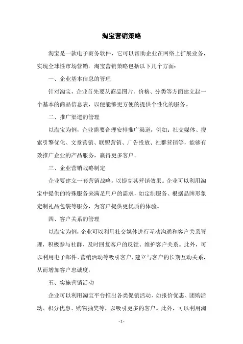 淘宝营销策略淘宝是一款电子商务软件,它可以帮助企业在网络上扩展业务,实现全球性市场营销。