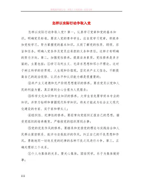 谈谈如何以实际行动争取早日入党一从庄严地向敬爱的党组织提交了入党申请书的那一刻起,我就期待着能早日成为党组织中的一员——一名光荣的共产党员,但是对于“怎样以实际行动争取入党?”这个对于一名入党积极分子来说极为重要的问题却从来没有一个清晰而条理的思考,只是想着要努力向党组织靠拢,要以一名合格的共产党员的标准要求自己,要加强政治理论学习,要及时了解学习党的方针与政策,要尽力做好本职工作以及力所能及的事,要努力学习提升能力等等。