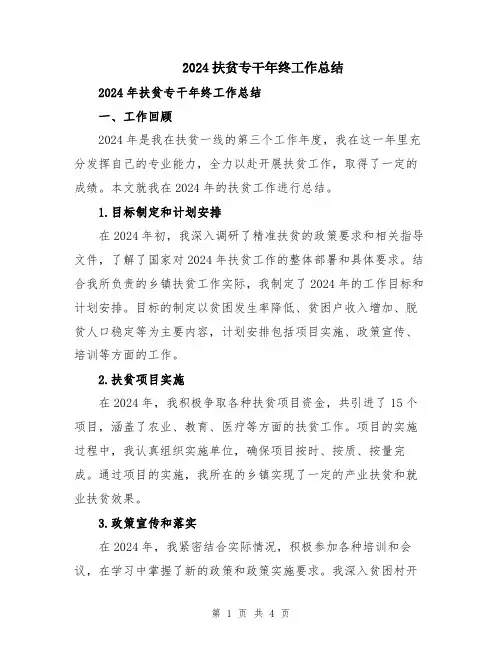 2024扶贫专干年终工作总结2024年扶贫专干年终工作总结一、工作回顾2024年是我在扶贫一线的第三个工作年度,我在这一年里充分发挥自己的专业能力,全力以赴开展扶贫工作,取得了一定的成绩。