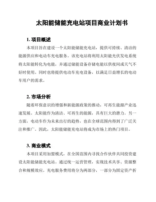 太阳能电站创业项目计划书项目名称:太阳能电站创业项目计划书项目背景随着全球对可再生能源的需求日益增长,太阳能电站作为一种环保、可持续发展的能源选择,受到了越来越多国家和地区的关注和支持。