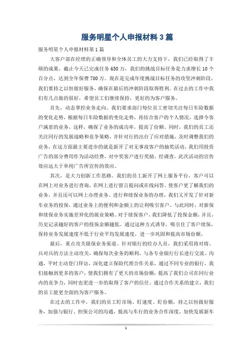 服务明星事迹材料篇一:服务明星申报材料在优质服务中谱写美好人生从走进中国电信启东分公司到如今一晃已经10年过去了,2006年6月通过竞聘上岗走上了近海支局长兼客户经理的工作岗位,在支局长兼客户经理岗位工作四年多来,我始终把中国电信“用户至上,用心服务”作为自己工作的座右铭,全心全意为客户服务。