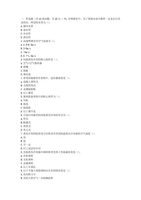 A.3.5-6.5m/sB.2-3m/sC.>3m/sD.0.7-1.5m/s3.间接蒸发冷却的核心构件是()。