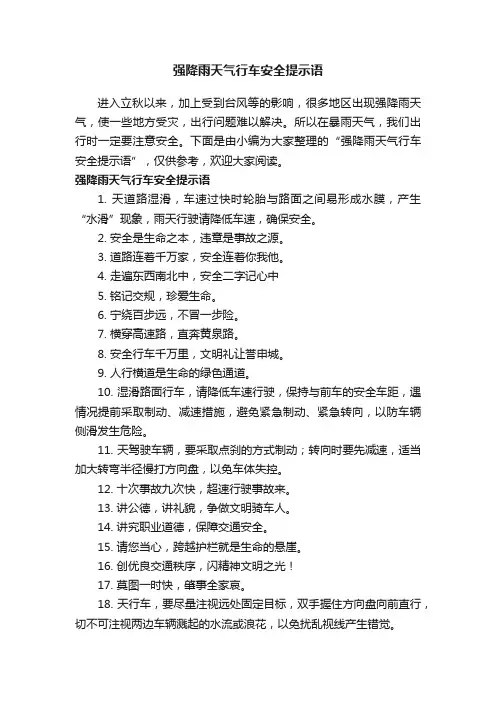 强降雨天气行车安全提示语1. 天道路湿滑,车速过快时轮胎与路面之间易形成水膜,产生“水滑”现象,雨天行驶请降低车速,确保安全。