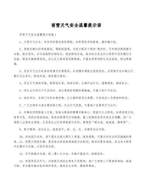 驾驶员下雨天安全温馨提示语一、引言下雨天是道路交通中较为复杂和危险的天气条件之一。