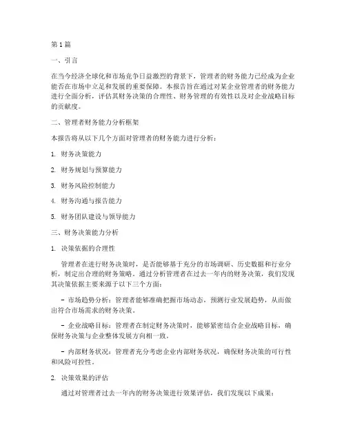 二、管理者财务能力分析框架本报告将从以下几个方面对管理者的财务能力进行分析:1. 财务决策能力2. 财务规划与预算能力3. 财务风险控制能力4. 财务沟通与报告能力5. 财务团队建设与领导能力三、财务决策能力分析1. 决策依据的合理性管理者在进行财务决策时,是否能够基于充分的市场调研、历史数据和行业分析,制定出合理的财务策略。