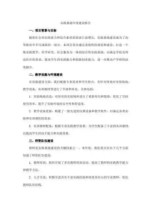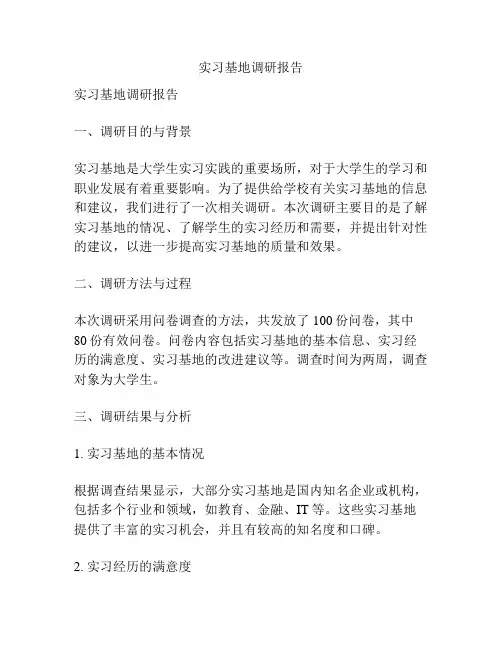 实训基地调研报告《实训基地调研报告》一、调研背景为了更好地了解实训基地的运作情况及其对学生实习能力的提升作用,我们对多家实训基地展开了调研,并撰写了本次报告。