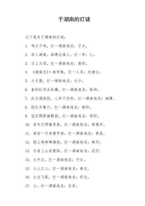【谜语大全】湖南地名谜语大全及答案 1. 谜语:岳阳一泱泱,湘水金城藏,芙蓉江里月,天下第一乡。