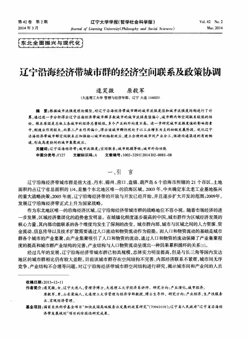 2.沿海经济带开发的战略意义2009年7月1日,《辽宁沿海经济带发展规划》获得国务院批准,辽宁沿海经济带作为整体开发区域被纳入国家战略。