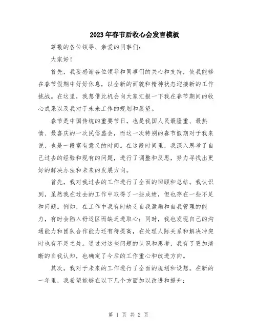 2023年春节后收心会发言模板尊敬的各位领导、亲爱的同事们:大家好!首先,我要感谢各位领导和同事们的关心和支持,使我能够在春节假期中好好休息,以全新的面貌和精神状态迎接新的工作挑战。