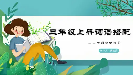 三年级下册语文全册课内词语搭配汇总第一单元动词(平添)生趣(闻到)清香(展开)花瓣(停止)舞蹈(吃)嫩叶(看)荷花(收拢)硬翅(露岀)小莲蓬(画)蚱蜢修饰词(乌黑)的羽毛(轻快有力)的翅膀(如毛)的细雨(纤细)的电线(烂漫无比)的春天(有趣)的图画(嫩蓝)的春天(旷亮无比)的天空(碧绿)的大圆盘(灵敏)的视觉(波光粼粼)的湖面(雪白)的衣裳(鲜艳)的小圆点(挨挨挤挤)的荷叶(嫩黄色)的小莲蓬(可爱/活泼)的小燕子(微微)地吹拂(款款)地落(闲散)地休憩(静静)地站(一圈一圈)地荡漾量词一(身)羽毛一(双)尾巴一(对)翅几(痕)细线几(支)木杆一(幅)图画一(阵)清香两(片)花瓣一(朵)荷花一(段)距离一(辆)小车一(泡)口水第二单元动词(盛)东西(破成)碎片(感到)羞耻(覆盖)尘土(掘开)堆积物(发现)影子(泛起)波纹(噘起)嘴(皱起)眉头(受到)尊敬(抓住)机会(停下)脚步(背着)货船(驮着)木筏(推究)哲理(遵循)规律(保持)清洁(传来)脚步声修饰词(懦弱)的东西(骄傲)的铁罐(轻蔑)的神气(荒凉)的废墟(漂亮)的鹿角(厚厚)的堆积物(匀称)的身段(清清)的池水(精美别致)的角(美丽)的珊瑚(有力)的长腿(凶猛)的狮子(沉重)的货船(柔软)的泥土(可怜)的池子(清闲)的生活(源源不断)的水(傲慢)地问(谦虚)地回答(惊讶)地说(痛痛快快)地喝(高兴)地叫(没精打采)地离开(悄悄)地逼近(远远)地甩(蜿蜒)地贯穿(安闲)地躺量词一(个)罐子一(只)鹿一(个)池塘一(面)镜子一(束)珊瑚一(阵)清风一(条)腿一(头)狮子一(条)河第三单元形容词+名词(伟大)的贡献(好用)的纸(热闹)的场面(世界闻名)的石拱桥(精美)的图案(美丽)的水花(形态各异)的人(相互缠绕)的龙(宝贵)的历史文化遗产(名扬中外)的画形容词+动词(完整)地保存(悠闲)地溜达动词(创造)文字(记录)事情(吸收)经验(横跨)河面(节省)石料(减轻)冲击力(雕刻)图案(吐出)水花(改进)造纸术量词一(件)事情一(册)书一(层)薄片一座石拱桥两(条)龙一(个)桥洞第四单元动词(吹)喇叭(做)实验(提)蜜蜂(做)记号(采)花粉(养)小鱼小虾(检查)蜂窝(放飞)蜜蜂(舒展)花瓣(适应)温度(绽开)花蕾(减少)阻力(传播)花粉(结出)种子(露出)笑脸(触到)地面(修建)花圃(辨认)方向(寻找)方向修饰词(遥远)的家(红红)的脸(艳丽)的蔷薇(娇嫩)的花瓣(干燥)的空气(淡雅)的花蕾(美丽)的笑脸(紫色)的小喇叭(超常)的记忆力(有趣)的小虾(安静)的角落(细长)的脚(争奇斗艳)的鲜花(芬芳迷人)的鲜花(美丽)的鲜花(悄悄)地绽开(不停)地舞动量词一(只)蜜蜂一(口)缸一(个)实验一(种)本能一(片)落叶第五单元动词(爬)楼梯(背)书包(冲)出来(打)雪仗(堆)雪人(眨)眼睛(打开)背包(拿出)作业部(变成)一棵树修饰词(浩瀚)的星空(很远)的地方(香喷喷)的饭菜(暄腾腾)的被子(各种形状)的鸟窝(茫茫)的宇宙(丁零丁零)的声音(悠闲)地坐(羡慕)地说(奇怪)地望(轻轻)地荡来荡去(大口大口)地啃量词一(个)秘密一(座)城市一(条)街道一(栋)房子一(棵)树一(根)树枝一(朵)白云一(块)糖醋排骨第六单元动词(扇动)翅膀(拨动)浪花(弹)钢琴(钴出)泥土(抖落)雨珠(剪)头发(摆出)架势(摸)耳朵(露出)头皮(吹)肥皂泡(揉出)眼泪(飞越)山巅(蘸)肥皂水(叠)花篮(表示)歉意(守)信用修饰词(锃亮)的剃刀(翘起)的头发(充分)的自信(机灵)的小朋友(笨拙)的表演(黏稠)的肥皂水、(轻圆)的泡儿(殷切期待)的目光(五色)的浮光(尖尖)的嘴巴(轻清透明)的球面(玲珑娇软)的小球(时髦)的发式(美丽)的梦(软悠悠)地飘游(无声)地散裂(奇怪)地问量词短语一(只)红蜻蜓一(双)小手一(阵)水花两(排)银牙一(串)雨珠一(位)朋友一(顶)斗笠一(把)木尺一(把)剃刀一(绺)头发一(朵)山花一(声)欢叫一(只)小木碗一(支)竹笔套管一(个)泡儿第七单元动词(变幻)颜色(带来)绿荫(洒满)光芒(张开)翅膀群星(闪烁)积雪(融化)(射进)深海(遇到)危险(攻击)动物修饰词(奇妙)的世界(诱人)的颜色(锋利)的刀剑(圆润)的樱桃(漂亮)的翅膀(凶猛)的狗(闪烁)的星星(各种形状)的卵石(透明)的玩具气球(神奇)地来到(仔细)地观察(笑盈盈)地看(威武)地蹲(噼噼啪啪)地降落量词一(个)大火球一(支)蜡烛一(粒)种子一(把)刀剑一(片)黑暗一(种)声音一(头)大狮子一(匹)马一(条)大狗第八单元动词(做)棉袄(取)衣服(夹起)布料(摆放)帽子(贴)广告(钻进)驴圈(吃)干草(赶)牲口(解开)缰绳(拿出)铁链(拿着)大刀长枪修饰词(美观大方)的棉袄(各式各样)的帽子(圆圆)的脑袋(又湿又滑)的山坡(密密麻麻)的方帽子(毛乎乎)的东西(满意)地走(惊讶、恼怒)地瞪(慢慢)地长大(惊恐)地大喊(惊慌)地喊(安安稳稳)地吃(狠狠)地打(大摇大摆)地走量词一(位)顾客一(卷)布料一(件)棉袄一(截)袖子一(顶)帽子一(张)广告一(户)人家一(只)老虎一(头)胖驴。