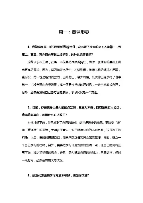 篇一:意识形态1、我觉得在高一时只要把成绩保持住,没必要下很大的功夫去争第一,到高二、高三,再在原有基础上加把劲,这种认识正确吗?这种认识不正确,在高一不仅要把成绩保持住,同时,在原有的基础上提出更高的要求。