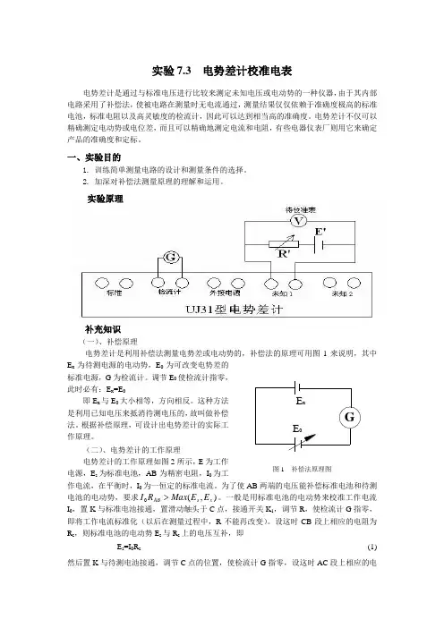 实验十用直流电位差计校准电表实验目的:1、了解补偿法测电势差的原理及优点。