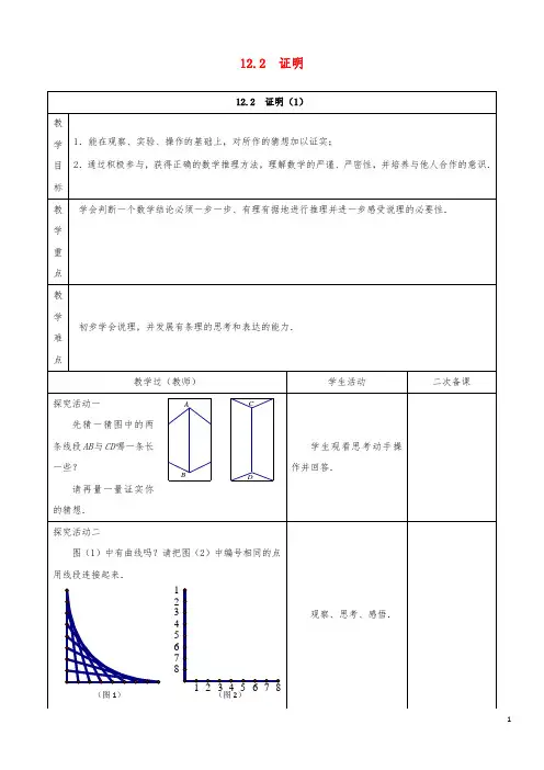 12.2 证明(1)-----眼见未必为实教学目标:1. 经历探索一些问题时,由于“直观判断不可靠”、“直观无法做出确定判断”,但运用已有的数学知识和方法可以确定一个数学结论的正确性的过程,初步感受证明的必要性.2. 尝试用证明的方法解决问题,体验证明须步步有据,培养学生严密分析问题的能力.3. 通过实验、操作、探索,培养学生辨证分析问题的能力和逆向思维的能力;懂得任何事物都是正反两方面的对立统一体. 教学重点:体会眼见未必为实,感受证明的重要性。
