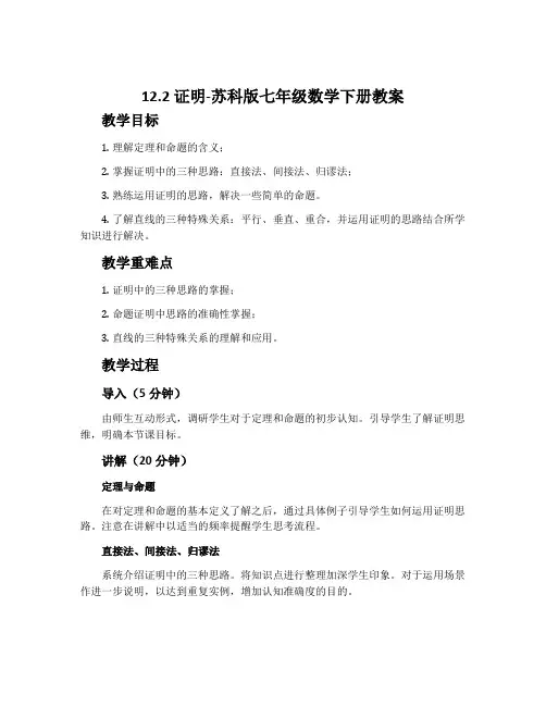 12.2 证明-苏科版七年级数学下册教案教学目标1.理解定理和命题的含义;2.掌握证明中的三种思路:直接法、间接法、归谬法;3.熟练运用证明的思路,解决一些简单的命题。