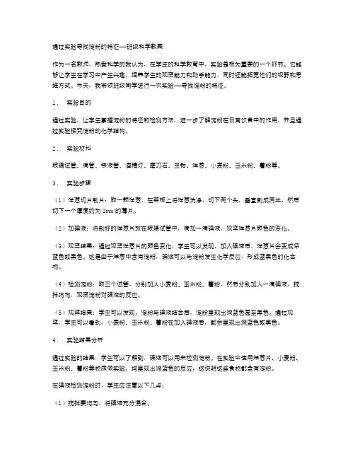 九、课后反思及拓展延伸1. 教师反思:观察幼儿在实验操作中的表现,了解他们对淀粉概念的理解程度,针对问题进行个别指导。