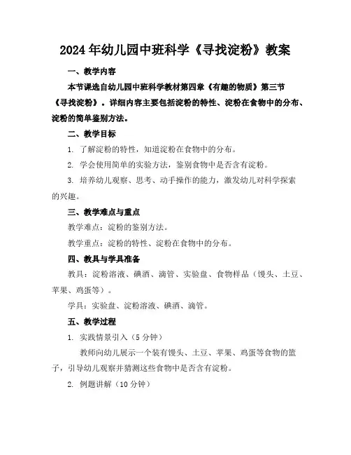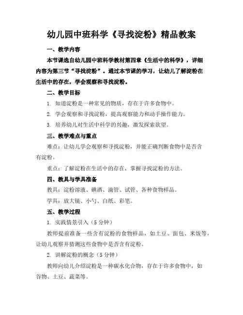 幼儿园中班科学《寻找淀粉》精品教案一、教学内容本节课选自幼儿园中班科学教材第四章《生活中的科学》,详细内容为第三节“寻找淀粉”。