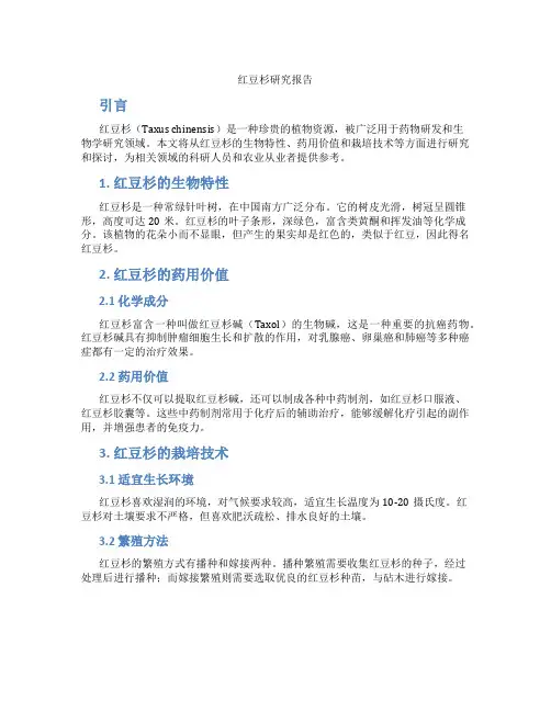 红豆杉研究报告引言红豆杉(Taxus chinensis)是一种珍贵的植物资源,被广泛用于药物研发和生物学研究领域。