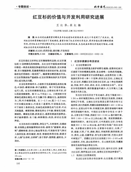 关键词:红豆杉、紫杉醇、开发利用Abstract:This paper describes the overview of the Taxus species resources on the development and utilization prospects, particularly medicinal ingredient of taxol in Taxus, a brief analysis of the current problems in the exploitation and utilization of Taxus.Keywords :Taxus、Taxol、exploitation and utilization红豆杉是红豆杉科( Taxaceae)、红豆杉属(Taxus)植物的总称,起源于古老的第三纪,曾广泛分布于北半球,第四纪冰川时期其分布范围大大缩小。