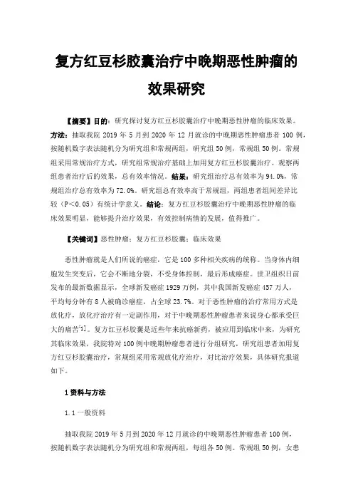 复方红豆杉胶囊治疗中晚期恶性肿瘤的效果研究【摘要】目的:研究探讨复方红豆杉胶囊治疗中晚期恶性肿瘤的临床效果。