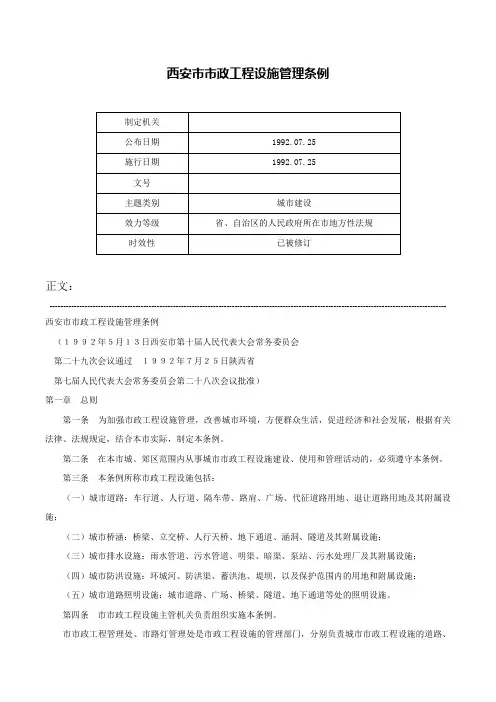 西安市市政工程设施管理条例正文:---------------------------------------------------------------------------------------------------------------------------------------------------- 西安市市政工程设施管理条例(1992年5月13日西安市第十届人民代表大会常务委员会第二十九次会议通过1992年7月25日陕西省第七届人民代表大会常务委员会第二十八次会议批准)第一章总则第一条为加强市政工程设施管理,改善城市环境,方便群众生活,促进经济和社会发展,根据有关法律、法规规定,结合本市实际,制定本条例。