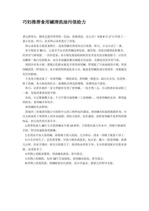 巧妇推荐食用碱清洗油污很给力煮完排骨后,锅里总留有厚厚的一层油,很难清洗,怎么办?本报9月17日刊登了一条小信息,昨日,众多热心读者进行了回复。