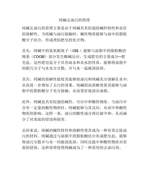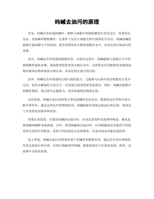 纯碱去污原理纯碱,又称碳酸氢钠,是一种常见的清洁剂,广泛用于家庭清洁和工业清洁中。