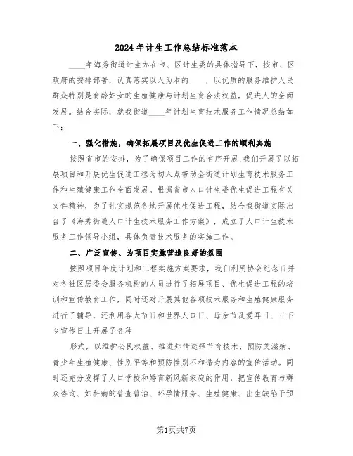 计划生育2024年工作总结及2024年工作计划____年计划生育工作总结____年是计划生育工作进一步加强和深化改革的一年。