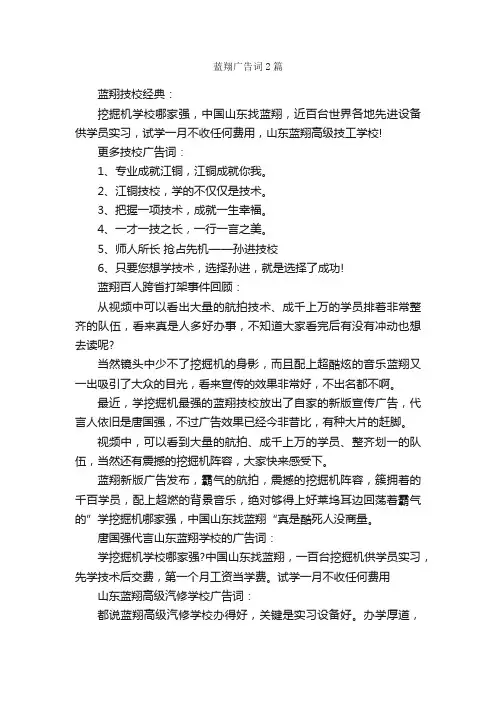 Take action, and then get to know yourself.通用参考模板(页眉可删)蓝翔技工学校广告词蓝翔技工学校已经成为中国人无人不知的学校了,如果你问别人蓝翔是什么?那么他肯定会回答你:学挖掘机的!哈哈~那么:学挖掘机技术哪家强?“中国山东找南翔!”以下是整理的:蓝翔技工学校广告词,欢迎阅读!蓝翔技工学校广告词【1】挖掘机学校哪家强,中国山东找蓝翔,先学技术后交费,第一个月工资当学费。