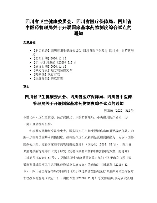 四川省卫生健康委员会、四川省医疗保障局、四川省中医药管理局关于开展国家基本药物制度综合试点的通知文章属性•【制定机关】四川省卫生健康委员会,四川省医疗保障局,四川省中医药管理局•【公布日期】2020.11.12•【字号】川卫函〔2020〕312号•【施行日期】2020.11.12•【效力等级】地方规范性文件•【时效性】现行有效•【主题分类】药政管理正文四川省卫生健康委员会、四川省医疗保障局、四川省中医药管理局关于开展国家基本药物制度综合试点的通知川卫函〔2020〕312号各市(州)卫生健康委、医疗保障局、中医药管理局,中央在川医疗机构,委(局)直属医疗机构:实施基本药物制度是党中央、国务院在卫生健康领域作出的重要战略部署。