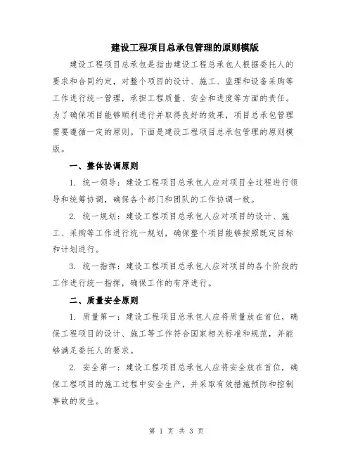 建设工程项目总承包管理的原则模版建设工程项目总承包是指由建设工程总承包人根据委托人的要求和合同约定,对整个项目的设计、施工、监理和设备采购等工作进行统一管理,承担工程质量、安全和进度等方面的责任。