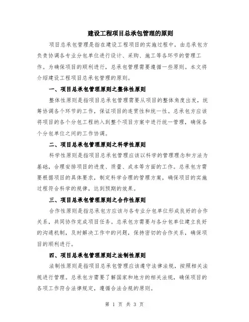 建设工程项目总承包管理的原则范本一、依法依规原则建设工程项目总承包管理必须依法依规进行,严格遵守国家法律法规、工程建设管理规范和相关政策,确保项目的合法性、规范性和可持续性。