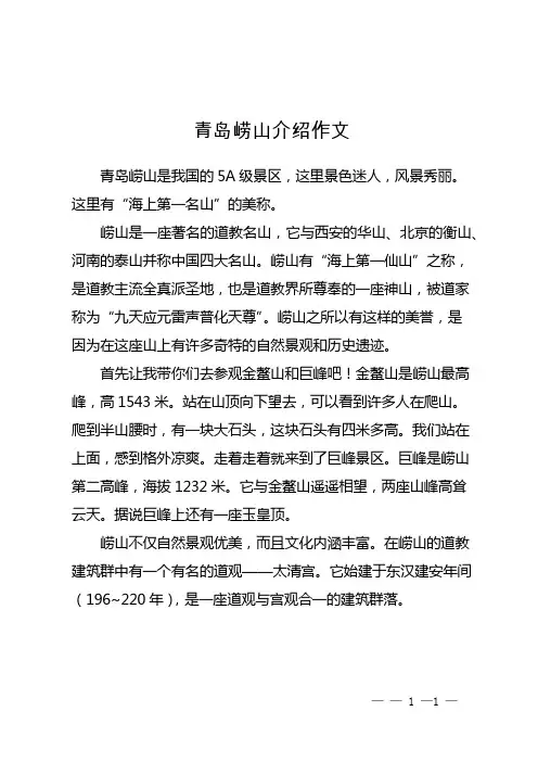 以下是一条常见的旅游线路:2.1 一日游线路•上午:前往崂山风景区,参观崂山道教文化景点。