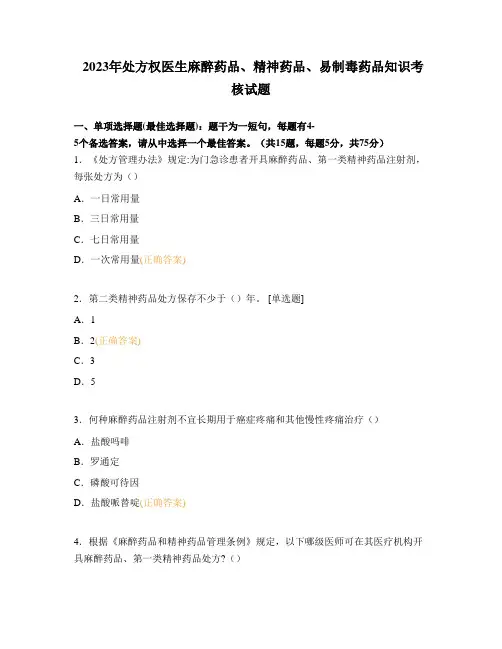 2023年处方权医生麻醉药品、精神药品、易制毒药品知识考核试题一、单项选择题(最佳选择题):题干为一短句,每题有4-5个备选答案,请从中选择一个最佳答案。