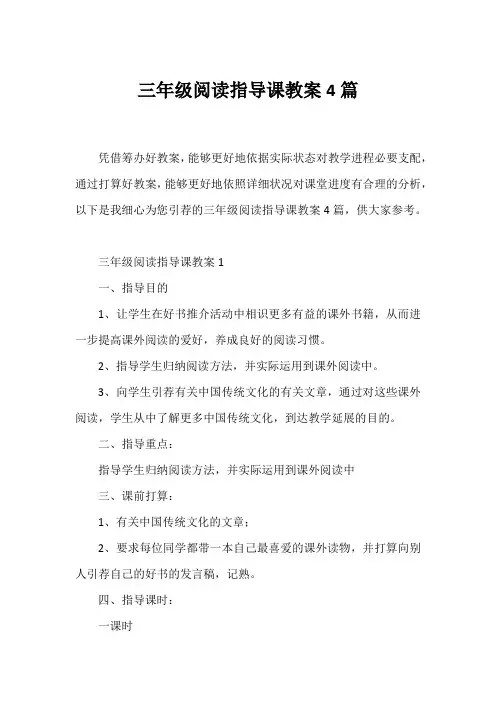 (课件出示)同学们,让我们爱上阅读吧,让阅读伴我们快乐成长!板书设计:阅读方法:读、查、划、摘、想、记【篇二:小学三年级阅读指导教案作者】小学三年级阅读指导教案——课外阅读指导课教学设计一、指导目的1、让学生在好书推介活动中认识更多有益的课外书籍,从而进一步提高课外阅读的兴趣,养成良好的阅读习惯。