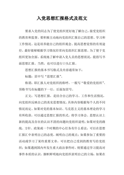 入党思想汇报格式及范文要求入党的同志为了使党组织更好地了解自己,接受党组织的教育和监督,要积极主动地向党组织汇报自己的思想、学习和工作情况。