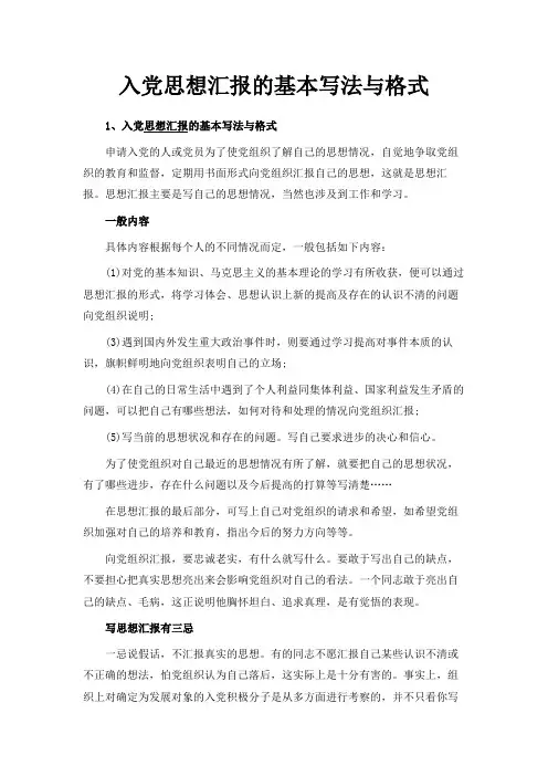 入党思想汇报的基本写法与格式1、入党思想汇报的基本写法与格式申请入党的人或党员为了使党组织了解自己的思想情况,自觉地争取党组织的教育和监督,定期用书面形式向党组织汇报自己的思想,这就是思想汇报。