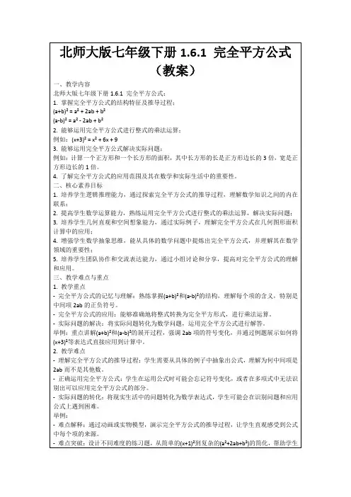 四、教学过程4.1 导入(1)引入完全平方的概念及基本定义,解释完全平方的概念及相关概念。
