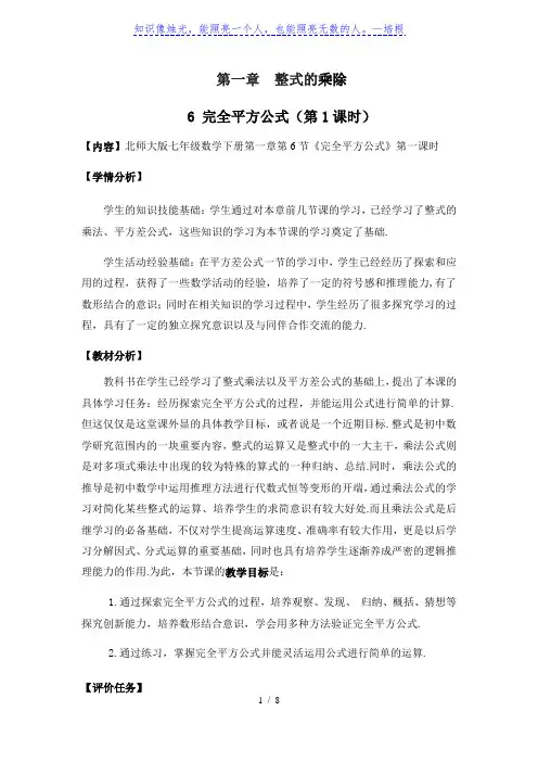 第一章整式的乘除6 完全平方公式(第1课时)【内容】北师大版七年级数学下册第一章第6节《完全平方公式》第一课时【学情分析】学生的知识技能基础:学生通过对本章前几节课的学习,已经学习了整式的乘法、平方差公式,这些知识的学习为本节课的学习奠定了基础.学生活动经验基础:在平方差公式一节的学习中,学生已经经历了探索和应用的过程,获得了一些数学活动的经验,培养了一定的符号感和推理能力,有了数形结合的意识;同时在相关知识的学习过程中,学生经历了很多探究学习的过程,具有了一定的独立探究意识以及与同伴合作交流的能力.【教材分析】教科书在学生已经学习了整式乘法以及平方差公式的基础上,提出了本课的具体学习任务:经历探索完全平方公式的过程,并能运用公式进行简单的计算.但这仅仅是这堂课外显的具体教学目标,或者说是一个近期目标.整式是初中数学研究范围内的一块重要内容,整式的运算又是整式中的一大主干,乘法公式则是对多项式乘法中出现的较为特殊的算式的一种归纳、总结.同时,乘法公式的推导是初中数学中运用推理方法进行代数式恒等变形的开端,通过乘法公式的学习对简化某些整式的运算、培养学生的求简意识有较大好处.而且乘法公式是后继学习的必备基础,不仅对学生提高运算速度、准确率有较大作用,更是以后学习分解因式、分式运算的重要基础,同时也具有培养学生逐渐养成严密的逻辑推理能力的作用.为此,本节课的教学目标是:1.通过探索完全平方公式的过程,培养观察、发现、归纳、概括、猜想等探究创新能力,培养数形结合意识,学会用多种方法验证完全平方公式.2.通过练习,掌握完全平方公式并能灵活运用公式进行简单的运算. 【评价任务】任务一:会用多种方法验证完全平方公式任务二:掌握完全平方公式的特点任务三:能灵活运用公式进行简单的运算【评价标准】1、学生通过观看视频,在问题指引下积极思考,交流合作,得出和的完全平方公式合作探究1;2、学生通过类比,自主学习,交流合作,顺利完成合作探究2;3、学生通过例题, 自主练习,课堂检测等检测易错点,进行课堂反馈.【评价方式】以交流式评价和表现性评价以及检测性评价为主.1、交流式评价通过师生、生生对话交流,及时对学生进行评价.评价内容如下:根据学生对以下活动的开展情况检测任务的完成.针对评价任务1:学生能通过完成合作探究1 得出和的完全平方,学生能类比完成探究2的问题得出差的完全平方针对评价任务2:学生能在问题指引下积极思考,能用自己语言归纳出完全平方公式的结构特点.针对评价任务3:通过例题, 自主练习,课堂检测的问题地解决,学生通过与老师的互动,与同伴的互动能明晰概念.2、表现性评价通过小组合作,师生互动,给学生更多机会发言和表现自己,在自然放松状态下,老师可以及时诊断学情,调查教学效果.3、检测性评价通过自主学习检测和当堂检测环节,对学生进行检测性评价,及时查漏补缺,确保达到预期的教学效果.【教学过程】本节课设计了七个教学环节:回顾与思考、学习目标展示、完全平方公式的获得、完全平方公式的运用、课堂小测、课堂小结、布置作业.第一环节回顾与思考活动内容:复习已学过的平方差公式1. 平方差公式:(a+b)(a-b)=a2-b22. 公式的结构特点:左边是两个二项式的乘积,即两数和与这两数差的积.右边是两数的平方差(同相平方-反相平方).3.我们用什么方法得到平方差公式?活动目的:本堂课的学习方向仍是引导鼓励学生通过已学习的知识经过个人思考、小组合作等方式推导出本课新知,进一步发展学生的符号感和推理能力.而这个过程离不开旧知识的铺垫,平方差公式的学习有很多教学环节和形式与本节的学习是类似的,其中包含的基本知识与基本能力也仍是本节的精神主旨,因而复习很有必要.第二环节学习目标展示1.通过探索完全平方公式的过程,培养观察、发现、归纳、概括、猜想等探究创新能力,培养数形结合意识,学会用多种方法验证完全平方公式.2.通过练习,掌握完全平方公式并能灵活运用公式进行简单的运算.设计意图:学习目标是课堂教学的核心和灵魂,是课堂教学的出发点和归宿,它具有导向、调控、激励、评价等功能.学习目标的展示既有利于学生明确“学什么”和课后评价“学”得怎么样,有利于教师明确学生“怎么学”和教师“怎么教”的问题.学习学目标是教和学双方合作实现的共同目标.既是教师教的目标,也是学生学的学习目标第三环节完全平方公式的获得【合作探究】1:观看视频:从前,有一个国王的公主被妖怪抓到了森林里,两个农夫一起去森林里打猎时打死了妖怪救出了公主,国王要赏赐他们,这两个农夫原来各有一块边长为a米的正方形土地,第一个农夫就对国王说:“您可不可以再给我一块边长为b米的正方形土地呢?”国王答应了他,国王问第二个农夫:“你是不是要跟他一样呀?”第二个农夫回答:“不,我只要您把我原来的那块土地的边长增加b米就好了.”国王想不通了,他说:“你们的要求不是一样的吗?”你认为他们的要求一样吗?①根据故事情景补全下面两图.②图中你能得到(a+b)2 等于 a2+b2吗?如果不相等,请比较出相错多少,那么你认为(a+b)2=?③有其他的方法来验证这个结论吗?设计意图:通过故事情景引发学生兴趣,由面积问题得出完
