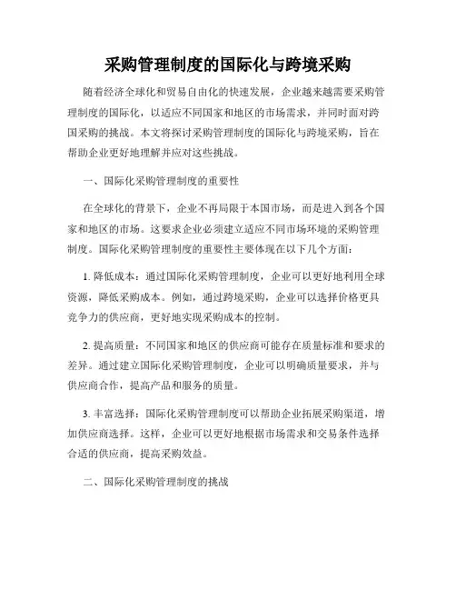 采购管理制度的国际化与跨境采购随着经济全球化和贸易自由化的快速发展,企业越来越需要采购管理制度的国际化,以适应不同国家和地区的市场需求,并同时面对跨国采购的挑战。