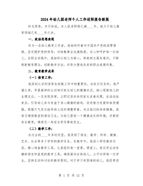 2024年幼儿园老师个人工作述职报告新版时光荏苒,岁月如流。