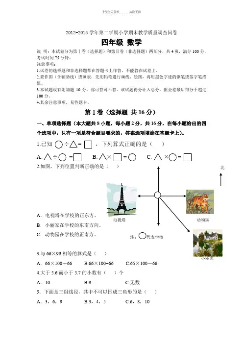最新人教版小学数学四年级下册期末( 试卷 +答题卡 +答案 )第Ⅰ卷(选择题共16分)一、单项选择题(本大题共8 小题,每小题 2 分,共 16 分,在每小题给出的四个选项中,只有一项是符合题目要求的,答案选项填涂在答题卡上).1.已知÷=,下列算式正确的是()A.÷= B.×= C.×=、2.如图,下列位置判断正确的是()..A .电视塔在学校的正东方.电视塔B.小丽家在学校的东南方向.C.动物园在学校的正南方.注:代表学校3.与 66×99 相等的算式是()A . 66×100-66 B.66×100+66 C.65×100-664.大于5.6 而小于 5.7 的小数有()个A . 10 B.9 C.无数5.下面是三组线段,其中不可以围成三角形的是()北动物园小丽家A.3,6,9 B.3,4,5 C.6,8,106.等腰三角形一个底角是 30°,那么它的顶角是()A.30° B.60° C.120°7.用 4,5, 6 和小数点可以组成()个两位小数A . 6 B.9 C.128.下列算式中,计算结果最大的是()A . 620÷ 18-7×2 B. (620÷18-7)× 2 C. 620÷( 18-7×2)第Ⅱ卷(非选择题共84分)二、填空题(本大题共14 个空,每个空 1 分,共 14 分,把答案填在答题卡中) .9.小刚用天平称了 10 克大米,数了数约有500 粒.( 1)每 100 粒大米重克;( 2)平均一粒米重克,这个数读作克;( 3)2010 年我国人口普查数据全国总人口为十三亿七千零五十三千万六千八百七十五人,横线上的数字写作,改写成以“亿”为单位的数保留到整数约是亿 .10.小红期中考试成绩,语文、数学、英语三科平均分86 分,已知语文得分 90分,数学和英语两科平均分是分 .11.找规律填数:① 0.4,0.8,1.2,,2.0②,1.5,2.1,2.8,3.6,12.用 1,2,7,8 四个数字和小数点组成的最大的两位小数是,最小的两位小数是.13.三角形具有性,内角和度.14.看地图时辨别方向要牢记.三、判断题(本大题共 4 小题,每小题 1 分,共 4 分,把答案填涂在答题卡上) .15.25× 102=25×100+25×2 运用了乘法结合律 .()16.等腰三角形不一定是锐角三角形 .()17.3.103 精确到百分位是 3.1()18.在三角形中,最长的边对的角也是最大 .()四、作图题(本大题共 2 小题,每小题 3 分,共 6 分,请把图画在答题卡上).19.画一个两条直角边分别是3cm,4cm 的直角三角形并作出它斜边上的高.20.作一个顶角为 60°腰长为 2cm 的等腰三角形 .五、计算题(在答题卡上作答, 21 小题可直接写出答案, 22 和 23 小题必须写出必要的步骤, 21 小题 4 分, 22 小题 6 分, 23 小题 10 分,共 20 分) .21.口算10.38+0.62+2=0.28× 100÷10=33÷11× 5=81÷ 9× 8=22.简便运算① 73.26-( 18.9+3.26)②25× 25×1623.列式计算(1)甲数比乙数少 3.64,甲数是 6.78,甲、乙两数的和是多少?(2)整数部分是 0 的最大的两位小数减去整数部分是 0 的最小的三位小数,差是多少?六、解答题(在答题卡上作答,写出必要的解题步骤,本大题共 5 小题,每小题8 分,共 40分).24.(1)在比例尺是 1:5000 的图纸上,量得一个长方形花园的长是 10cm,宽是8cm,这个花园的实际面积是多少平方米?( 2)右图是新鲜水果店运进香蕉、西瓜、苹果三种水果数量的统计图.西瓜运进 270 千克,苹果运进多少千克?25.(1)小东家在学校正西面 2000 米处,请你计算后并画出小东家到学校的图上距离的路线图.( 2)测量并计算小明家到学校的实际距离.(3)周末小东从家骑自行车经过学校去小明家,每分钟行 250 米,几分钟后到达小明家.第 24( 2)题图26.(1)求出下面三角形中各角的度数.第25题图∠1=° ;∠ 2=°.( 2)一个三角形的周长是分米,其中有两条边的长度都是分米,还有一条边的长度是多少分米?这是一个什么样的三角形?27. 下面是某数码照相机厂2005--2008年两种型号照相机产量统计表.位:万台型号2005 年2006 年2007 年2008 年年份甲种照相机 15 23 30 40 乙种照相机10182545根据表中的数据,完成下面某数 照相机厂 2005--2008 年两种型号照相机 量 .(1)完成左 的 .(2)哪种相机 量增 的 快?(3)2008 年乙种相机是甲种相机 的几分之几?(4)2005 年到 2008 年甲种相机的 平均年 量是多少万台?28. 根据 目列出式子,并自 其中任意一条 行 算:....①爸爸把 20000 元 存入 行,定期二年,年利率是 5.85%,到期后利息多少元?②某工厂五月份交税 180 万元,比四月份多交了 20 万元,比四月份多交了百分之几?③加工 240 个零件,甲工人 独做需要 15 天完成,乙工人 独做需要 20 天完成,两人合作需要多少天完成?④在 1000 米的万安大 两 安装路灯,每隔 50 米安装一 (两端都要安装) , 一共需要准 多少 灯? 六、附加 .(10 分)2012-201329.学(年1第)(二6学分期小)学求期末:教①学质6+11+16+量调查问卷⋯答题+501卡 ② 101+102+103+104+⋯+999考号:( 2)(4 分)(某四年数级除以数学4,)乘以 5,再除以 6, 果是 615,求某数 .[0] [0] [0] [0] [0] [0] [0] [0] [0] [0] 学校班级姓名座位号试室号[1] [1] [1] [1] [1] [1] [1] [1] [1] [1][2] [2] [2] [2] [2] [2] [2] [2] [2] [2] 注意事项:[3] [3] [3] [3] [3] [3] [3] [3] [3] [3] 1、 答题前,考生务必用黑色字迹的钢笔或签字笔填写学校、班级、姓名、座[4] [4] [4] [4] [4] [4] [4] [4] [4] [4] [5] [5] [5] [5] [5] [5] [5] [5] [5] [5]位号和试室号,再用 2B 铅笔把考号的对应数字涂黑 . [6] [6] [6] [6] [6] [6] [6] [6] [6] [6] 2、 保持卡面清洁,不要折叠,不要弄破.[7] [7] [7] [7] [7] [7] [7] [7] [7] [7] 第 1页(共 4页)[8] [8] [8] [8] [8] [8] [8] [8] [8] [8][9] [9] [9] [9] [9] [9] [9] [9] [9] [9]单1 [A] [B] [C] [D]5 [A] [B] [C] [D] 判 15 [ √ ] [ ×] 选 2 [A] [B] [C] [D]6 [A] [B] [C] [D] 断 16 [√ ] [ ×]二、填空题 .(14 分)9.(1)(2)(3)10.11.①②12.13.14.四、作图题 .(6 分)19.(3 分)20.(3 分)五、计算题 .(20 分)21.(4 分)22.(6 分)①73.26-( 18.9+3.26)②25× 25×1623.(1)( 5 分)(2)(5 分)第2页(共 4页)六、