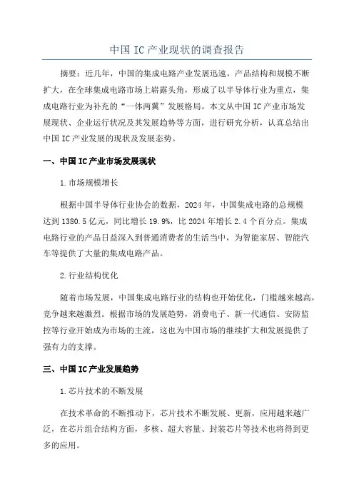 中国芯片制造商行业市场规模调研及投资前景研究分析报告博研咨询&市场调研在线网中国芯片制造商行业市场规模调研及投资前景研究分析报告正文目录第一章、中国芯片制造商行业市场概况 (3)第二章、中国芯片制造商产业利好政策 (4)第三章、中国芯片制造商行业市场规模分析 (6)第四章、中国芯片制造商市场特点与竞争格局分析 (8)第五章、中国芯片制造商行业上下游产业链分析 (9)第六章、中国芯片制造商行业市场供需分析 (11)第七章、中国芯片制造商竞争对手案例分析 (14)第八章、中国芯片制造商客户需求及市场环境(PEST)分析 (15)第九章、中国芯片制造商行业市场投资前景预测分析 (17)第十章、中国芯片制造商行业全球与中国市场对比 (19)第十一章、对企业和投资者的建议 (21)第一章、中国芯片制造商行业市场概况中国芯片制造业在过去几年中经历了显著的增长和发展,成为全球半导体产业链中的重要组成部分。